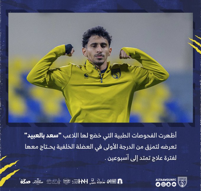 أعلن التعاون السعودي ، عن إصابه سعد بالعبيد لاعب فريق التعاون السعودي بالعضلة الخلفية عقب الكشف عن النتائج عن الفوصات الطبية .