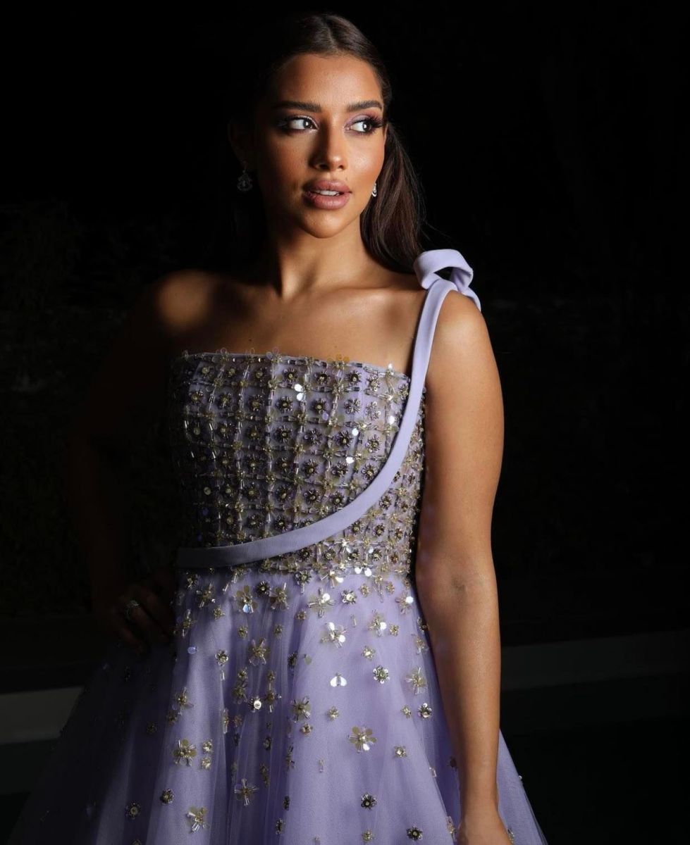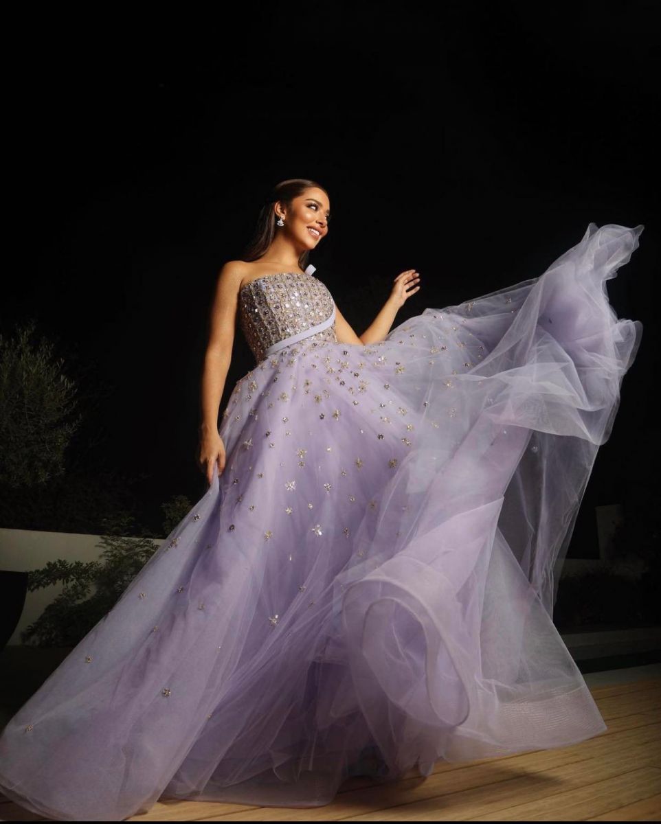 بدت بلقيس بفستان منفوش باللون البنفسجي الفاتح، ومُزين على أحد الكتفين بفيونكة رقيقة، ومطرز بالترتر شكل الورود، ومصنوع من الجزء السفلي من التُل؛ ليبرز أناقتها وقوامها الممشوق.