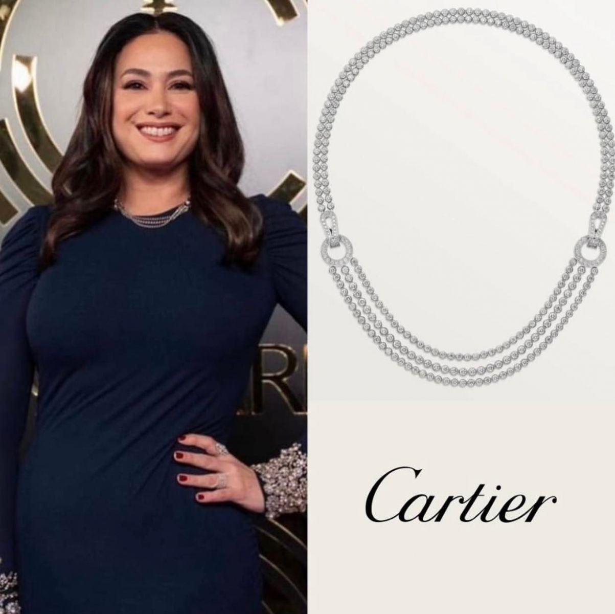 تزينت هند صبري بمجموعة من المجوهرات الراقية والمرصعة بالألماس، فضمت ثلاثة خواتم أحدهم مرصع بحجر أزرق في المنتصف، وحلق طويل، وأبرزهم عقد من دار الأزياء الشهير " Cartier "،