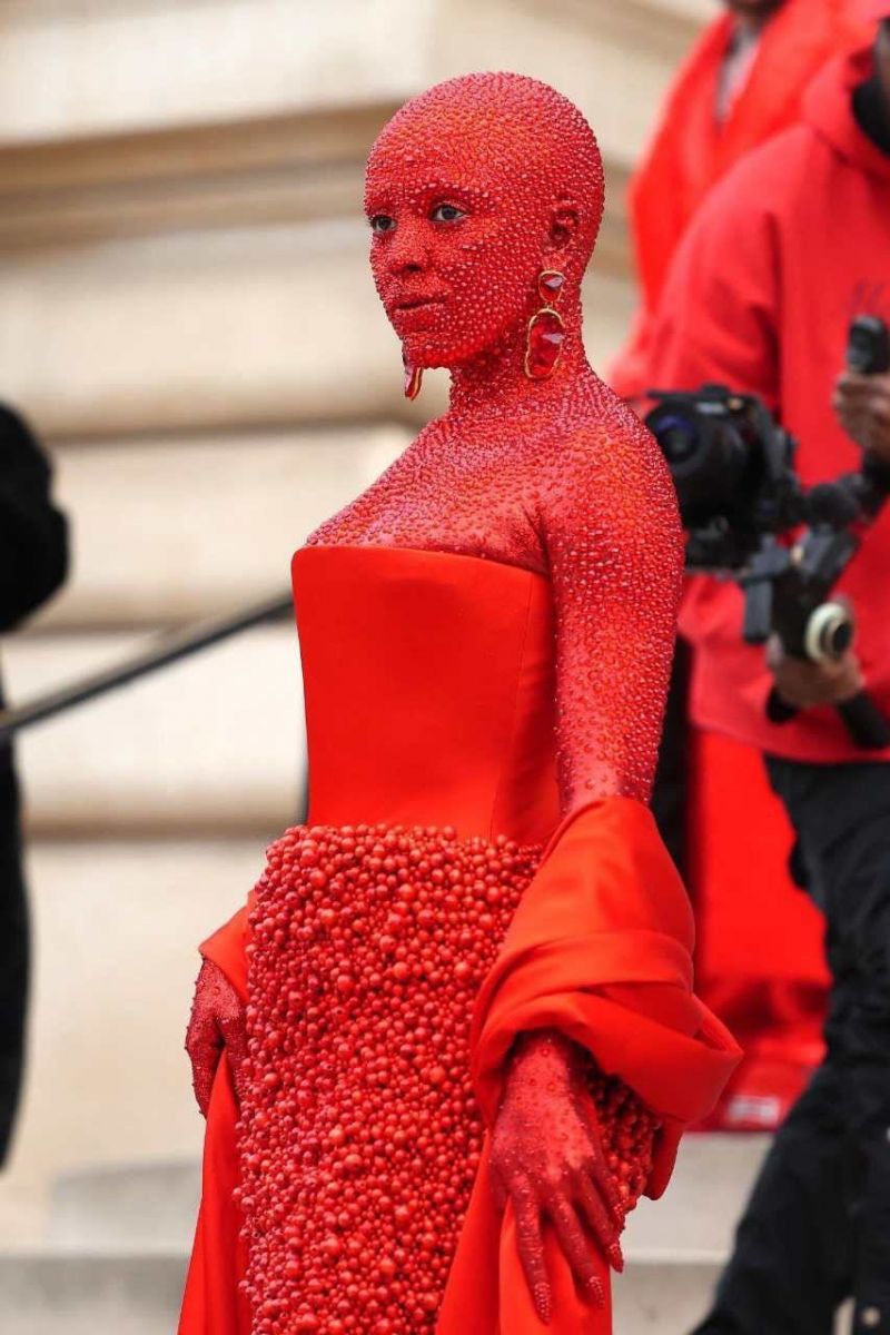 ولم تضع أي مكياج على وجهها؛ لأنها أخفت وجهها بقناع أحمر مرصع بالأحجار، كما غطت يديها وزراعيها بالكامل بنفس اللون.