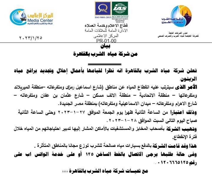 أعلنت شركة مياه الشرب بالقاهرة فى إطار قيامها بأعمال إحلال وتجديد رافع مياه الزيتون، سيتم انقطاع الخدمة عن بعض المناطق بمنطقة مصر الجديدة اعتبارا من الساعة الثانية ظهرا يوم الجمعة الموافق 27-1-2023 وحتى الساعة الثانية صباح اليوم التالى السبت الموافق 28-1-2023.