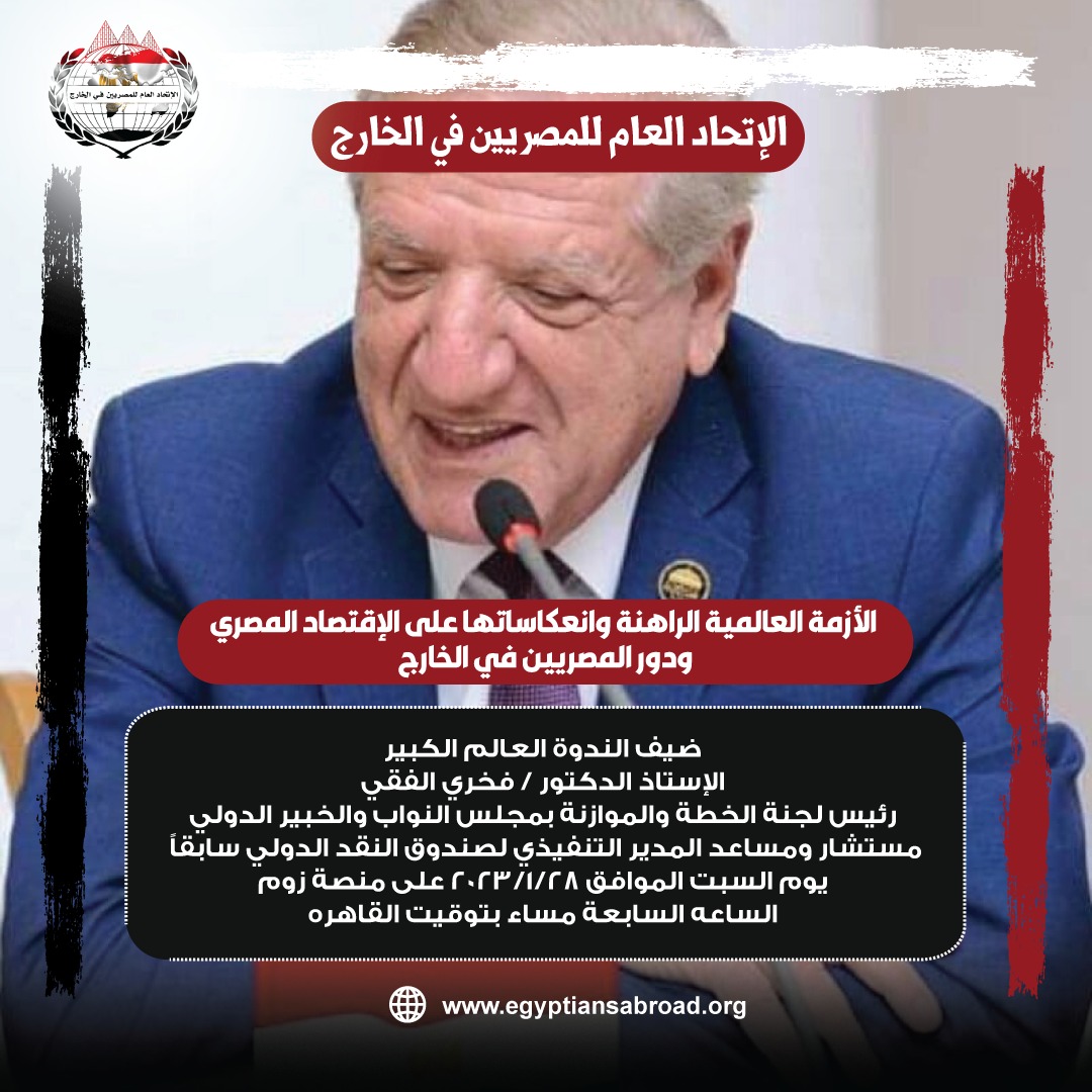 ينظم الاتحاد العام للمصريين في الخارج، اليوم في السابعة مساءً على منصة "زووم"، ندوة مهمة عن الاقتصاد المصري، وذلك تحت عنوان: " الأزمة العالمية الراهنة وانعكاساتها على الاقتصاد المصري ودور المصريين في الخارج".