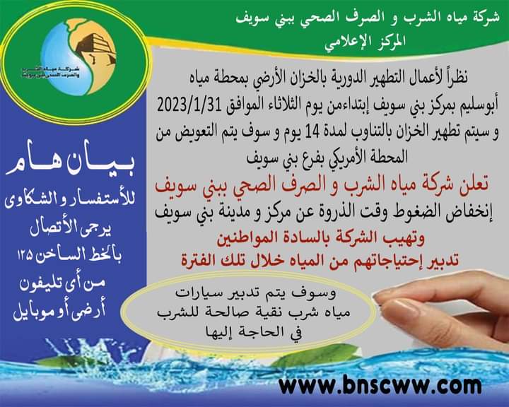 أعلنت شركة مياه الشرب والصرف الصحي، عن انخفاض ضغوط المياه وقت الذروة عن مركز ومدينة بني سويف اعتبارًا من غدٍ الثلاثاء 31 يناير بسبب التطهير الدوري للخزان الأرضي بمحطة مياه أبو سليم، حيث تتم أعمال التطهير بالتناوب ولمدة 14 يومًا على أن يتم التعويض من المحطة الأمريكي فرع بني سويف.