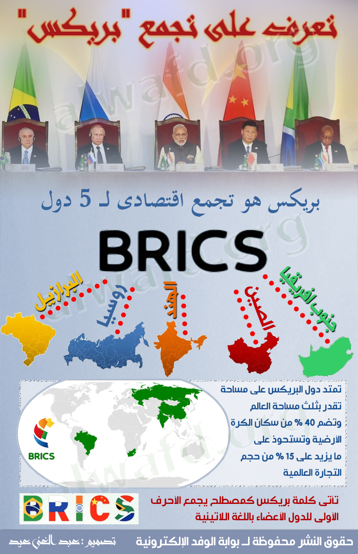 جدير بالذكر أنه تم إنشاء مجموعة "بريكس" عام 2009، وتتشكل من 5 دول هي الصين والهند وروسيا والبرازيل وجنوب أفريقيا، وتمثل "بريكس" 23% من الاقتصاد العالمي، و18% من تجارة السلع، و25% من الاستثمار الأجنبي، وتعد قوة مهمة لا يمكن تجاهلها في العالم، وقد تشهد الفترة المقبلة ضم دول جديدة للتجمع من بينها مصر والسعودية والإمارات.