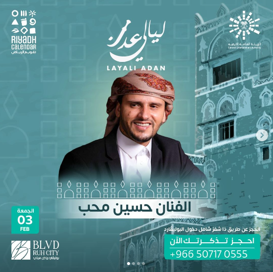 يحيي الفنان اليمني حسين محب، حفلًا غنائيًا في المملكة العربية السعودية، وذلك ضمن فعاليات تقويم الرياض، برعاية الهيئة العامة للترفيه، والذي يضم كوكبة من ألمع نجوم الغناء العربي والخليجي.
