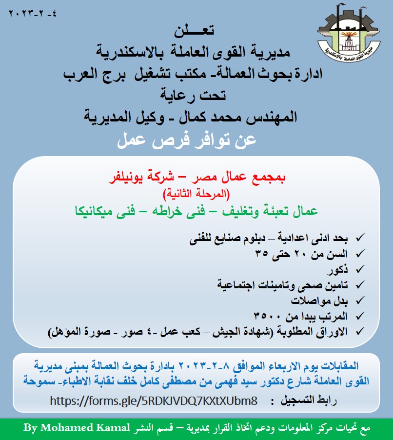أعلنت مديرية القوى العاملة بمحافظة الإسكندرية، بالتعاون مع مجمع "عمال مصر"، اليوم الثلاثاء، عن توفير فرص عمل للشباب عبارة عن ١٠٠ عامل تعبئة، و٣ فني خراطي، و١ فني ميكانيكا، بإحدى شركات القطاع الخاص.