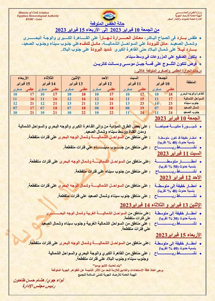 سيناء، وتوقعات بهطول كميات من الامطار تكون خفيفة إلى متوسطة على مناطق من السواحل الشمالية وشمال الوجه البحري على فترات متقطعة.