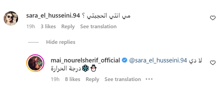 سرعان ما نفت مي نور الشريف أنباء ارتدائها الحجاب، خلال ردها على تعليقات متابعيها المُرفقة بالصورة، وذلك عبر حسابها الشخصي بموقع تبادل الصور والفيديوهات "إنستجرام"، حيث قالت: "أنا مش محجبة، دي درجة الحرارة".