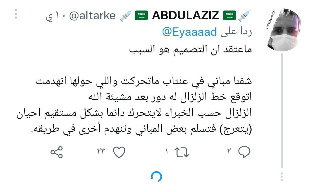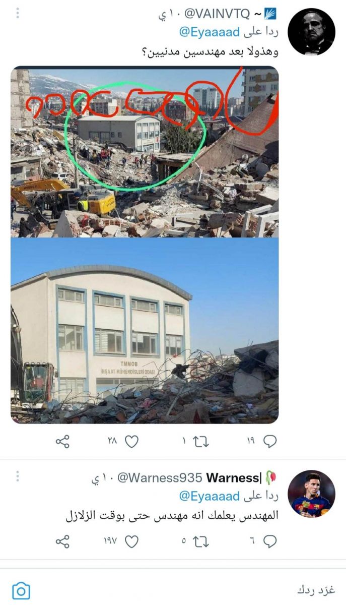 بينما نشر حساب آخر الصورة مظللًا على المباني الأخرى، التي باتت صامدة لم تتأثر بالزلزال كاتبًا: "وهدولا بعد مهندسين مدنيين؟".