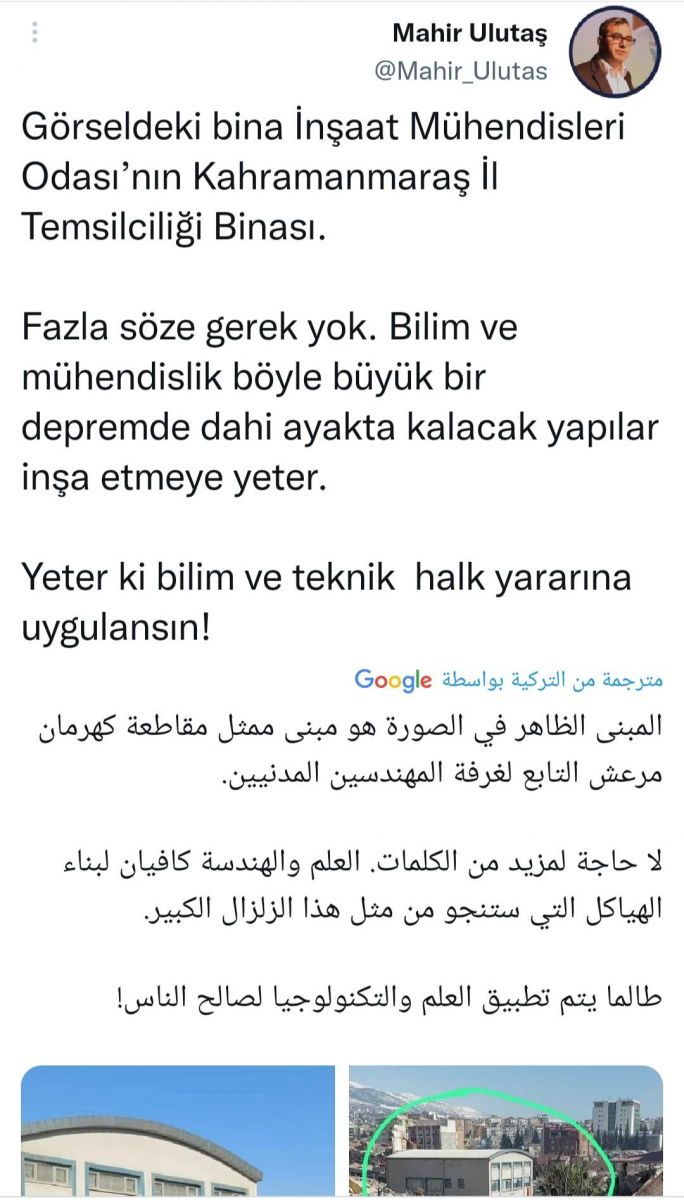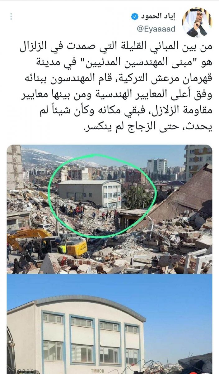دوَّنَ "الحمودي" على الصورة: "من بين المباني القليلة التي صمدت في الزلزال هو " مبنى المهندسين المدنيين" في مدينة كهرمان مرعش التركية، قام المهندسون ببنائه وفق أعلى المعايير الهندسية ومن بينها معايير مقاومة الزلازل، فبقى مكانه وكأن شيئًا لم يحدث، حتى الزجاج لم ينكسر".