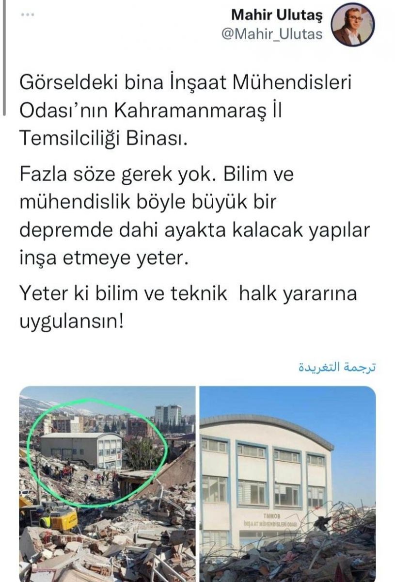 ونشر ماهر أولوتاش، رئيس مجلس إدارة غرفة المهندسين الكهربائيين في تركيا صورة المبنى أيضًا، وعن سبب عدم انهيار المنزل، كتب أولوتاش: يرجع ذلك إلى تأسيسه السليم وصلابة المواد المستخدمة في البناء، قائلًا: "حتى في مثل هذه الزلازل هناك مبانٍ يمكن أن تصمد طالما أسست ببنية سليمة، مضيفًا أن تطبيق الهندسة والعلم بشكل صحيح عن طريق تطبيق التكنولوجيا لصالح المواطنين كافيان لبناء هياكل ضد الزلازل".