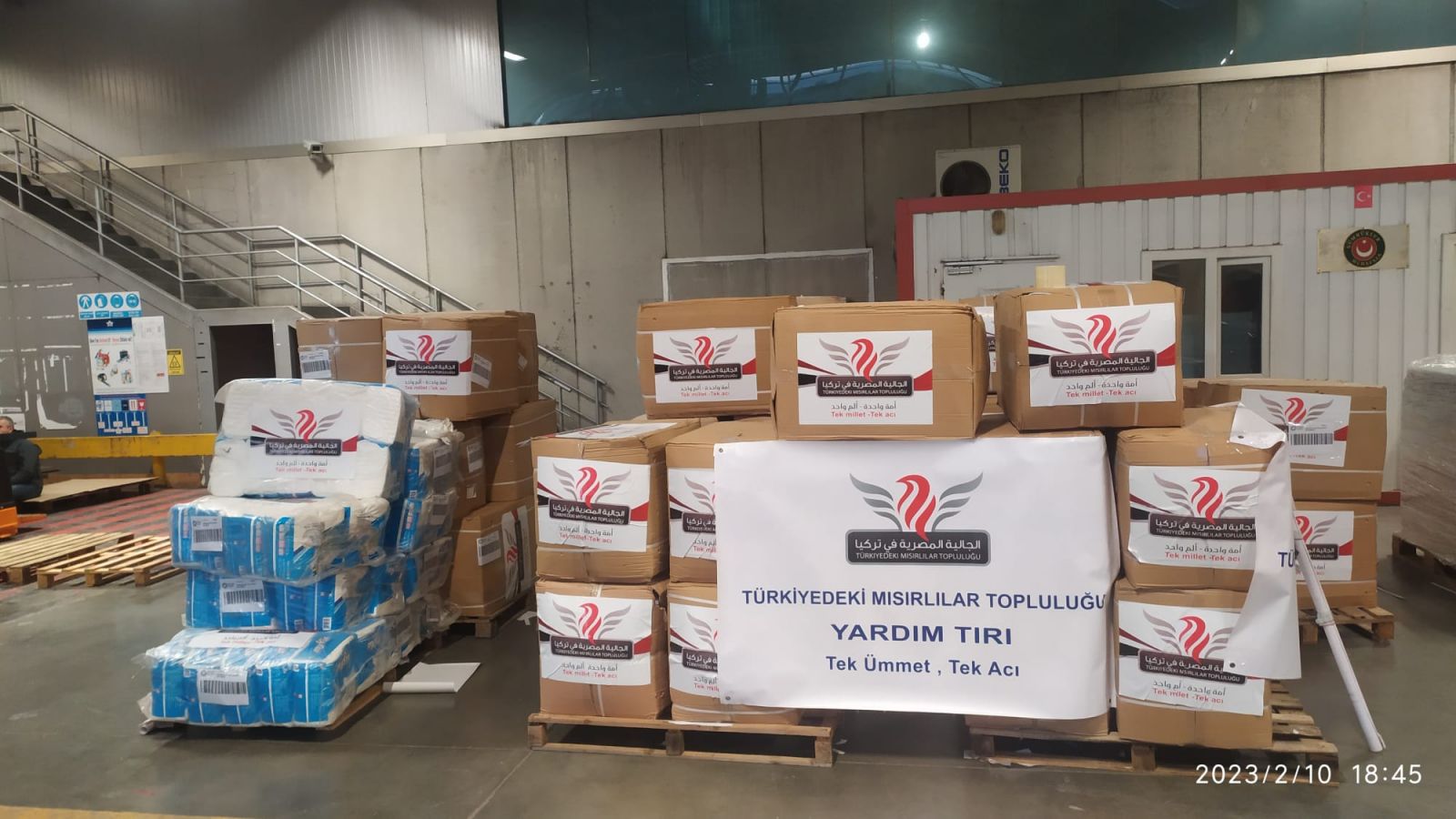 قد خرجت منذ يومين أول شحنة للجالية المصرية لإغاثة المنكوبين وهى عبارة عن بطاطين وأدوية مقدمة من أبناء الجالية المصرية بتركيا لذويهم وللعرب والأتراك المتضررين من زلزال تركيا.