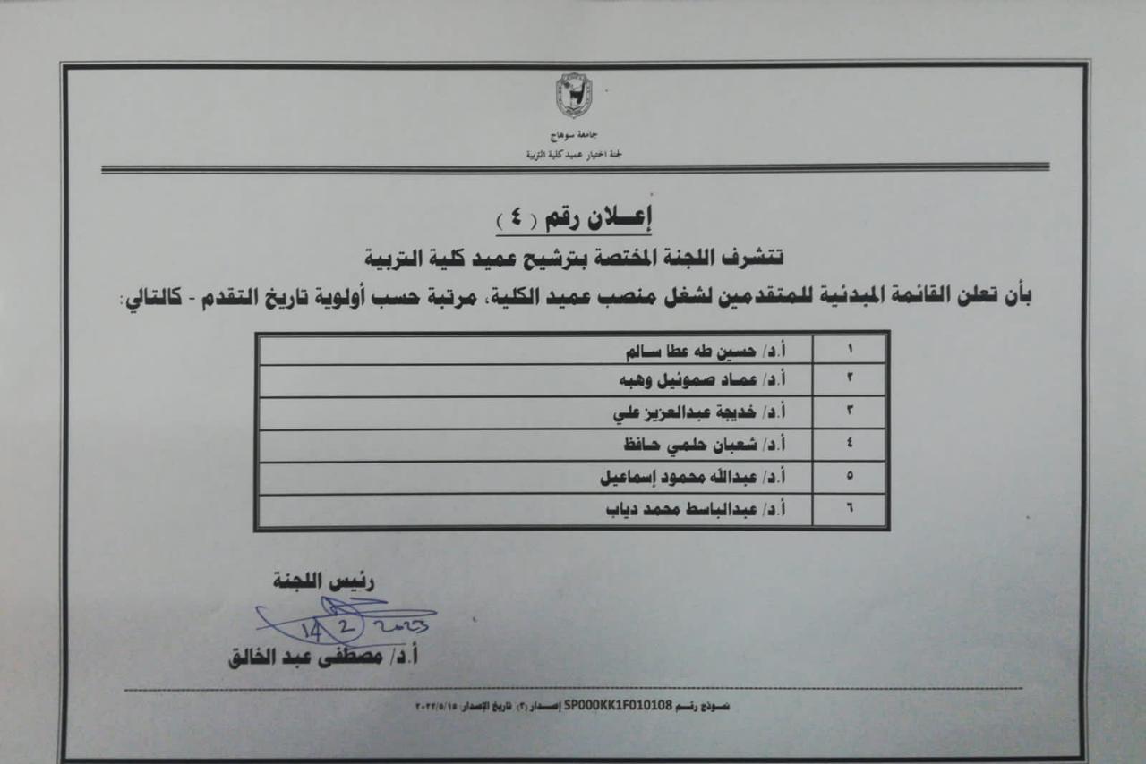 إعلان القائمة المبدئية للمتقدمين لمنصب عميد كلية التربية بجامعة سوهاج
