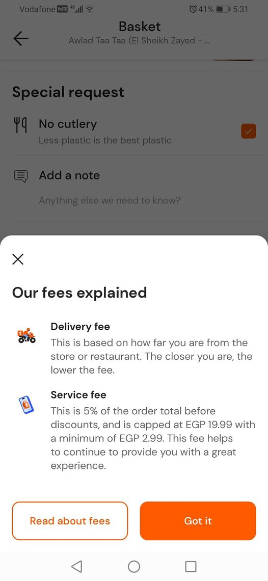 كما انتقدت شكوى أخرى فرض طلبات نسبة 5% مصاريف على الطلبات وهي تسمى service fees، قائلة: "هو مش Talabat أبليكيشن زي أي أبليكيشن توصيل بتجيبلي منتج من مكان محدد وبتاخد مقابل اللي هو التوصيل؟ أيه الحاجة الغريبة اللي بقالها فترة بيتبعوها وهي مصاريف خدمة ٥% من الأوردر المطلوب، خدمة لإيه، service fees دي ادفعها في المطعم لما يكون في ويتر بينزللي الأكل ومشكورًا بينضف مكاني بعد ما نخلص أكل ويشوف طلباتنا وإحنا قاعدين وهكذا إنما انتم بالفعل بتاخدوا مقابل شغلكم وهو التوصيل ده غير إن اسعاركم في أماكن كتير بقت أغلى من المطعم نفسه".