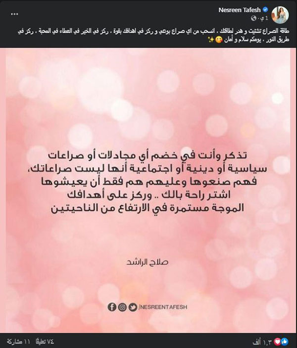 نسرين طافش علقت على صورة مقولة مأثورة قائلة.. "طاقة الصراع تشتيت و هدر لطاقتك، انسحب من أي صراع بوعي وركز في أهدافك بقوة، ركز في الخير في العطاء في المحبة، ركز في طريق النور، يومكم سلام وأمان"، وكانت الصورة التي شاركتها الفنانة الجزائرية نسرين طافش تحتوي على إحدى مقولات صالح الرشيد وهي: "تذكر وأنت في خضم أي مجادلات