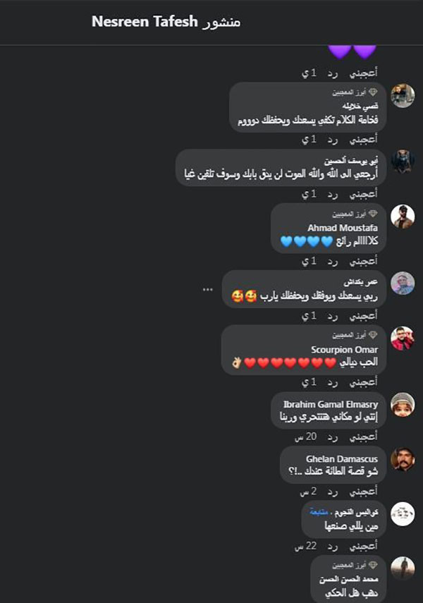 نسرين طافش علق الكثير من جمهورها ومتابعيها على مواقع التواصل الاجتماعي فقال أحدهم: "ارجعي الى الله والله الموت لن يدق بابك وسوف تلقين غيا" وقال آخر: "ربي يسعدك ويوفقك ويحفظك يارب" وقال متابع آخر: "شو قصة الطائة عندك".