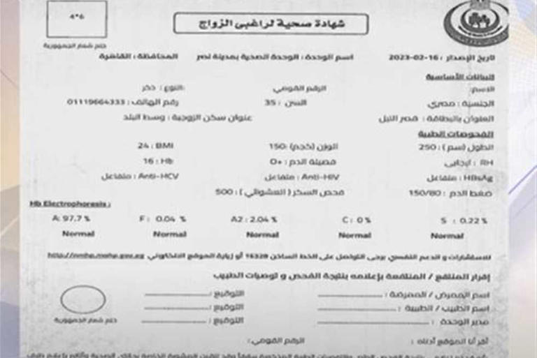 وأشارت الوزارة إلى أن شهادة فحص المقبلين على الزواج مربوطة بمجمع الوثائق المؤمنة والذكية، بما يضمن عدم إمكانية أحد تزويرها.