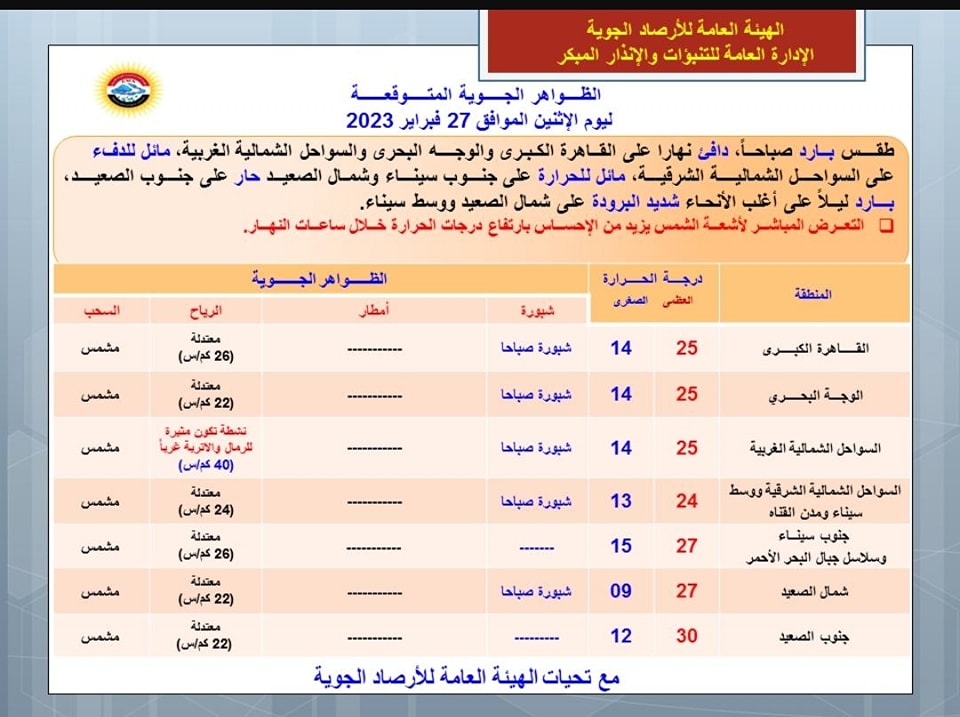 اقرأ ايضًا.. الأرصاد تكشف توقعاتها لحالة الطقس غدًا.. ارتفاع ملحوظ في الحرارة