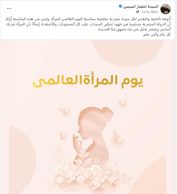 كتبت قرينة الرئيس عبدالفتاح السيسي، في منشور لها، عبر صفحتها الرسمية بموقع التواصل الاجتماعي، فيس بوك: "أتوجه بالتحية والتقدير لكل سيدة مصرية مخلصة بمناسبة اليوم