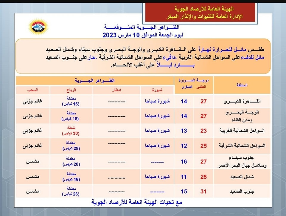 أعلنت الهيئة العامة للأرصاد الجوية، عن حالة الطقس ودرجات الحرارة المتوقعة غدًا الجمعة، إذ إنه يسود طقس مائل للحرارة نهارًا على القاهرة الكبرى والوجه البحري وجنوب سيناء وشمال الصعيد، ويكون مائل للدفء على السواحل الشمالية الغربية، ويكون دافئ على السواحل الشمالية الشرقية.