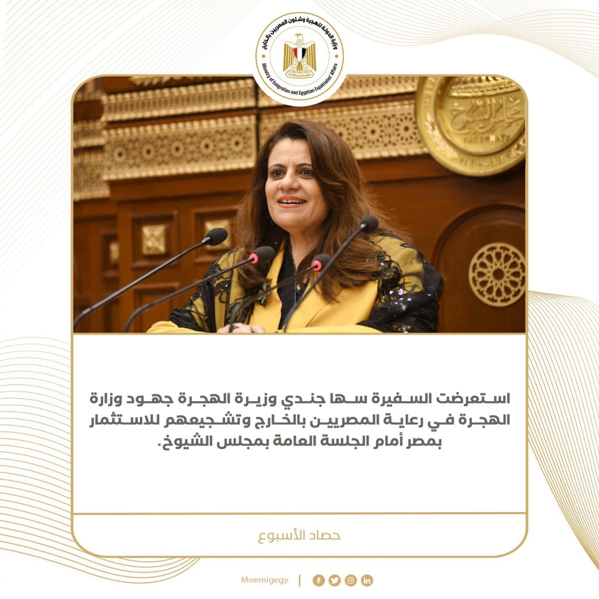 3) استعرضت السفيرة سها جندي وزيرة الهجرة جهود وزارة الهجرة في رعاية المصريين بالخارج وتشجيعهم للاستثمار بمصر أمام الجلسة العامة بمجلس الشيوخ.