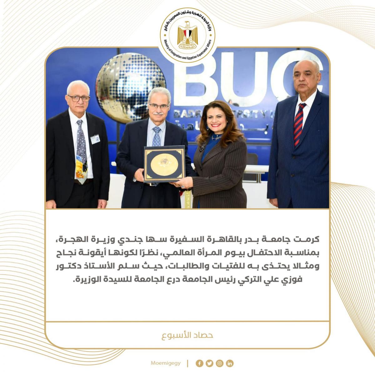 5) كرمت جامعة بدر بالقاهرة السفيرة سها جندي وزيرة الهجرة، بمناسبة الاحتفال بيوم المرأة العالمي، نظرًا لكونها أيقونة نجاح ومثالا يحتذى به للفتيات والطالبات، حيث سلم الأستاذ دكتور فوزي علي التركي رئيس الجامعة درع الجامعة للسيدة الوزيرة.