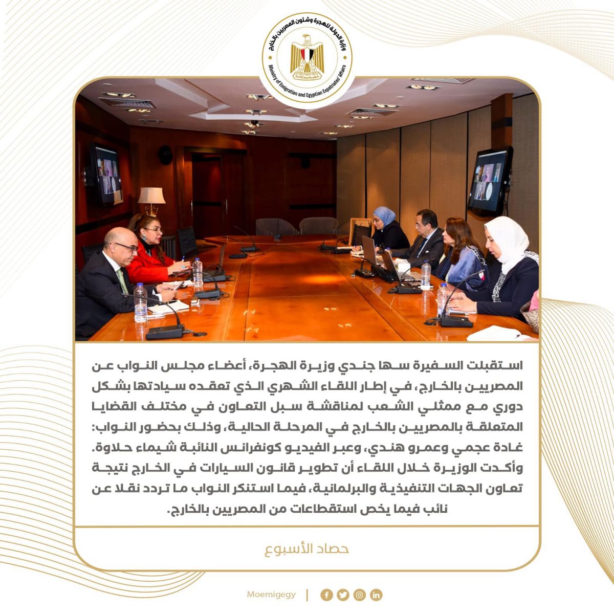 6) استقبلت السفيرة سها جندي وزيرة الهجرة، أعضاء مجلس النواب عن المصريين بالخارج، في إطار اللقاء الشهري الذي تعقده سيادتها بشكل دوري مع ممثلي الشعب لمناقشة سبل التعاون في مختلف القضايا المتعلقة بالمصريين بالخارج في المرحلة الحالية، وذلك بحضور النواب: غادة عجمي وعمرو هندي، وعبر الفيديو كونفرانس النائبة شيماء حلاوة. وأكدت الوزيرة خلال اللقاء أن تطوير قانون السيارات في الخارج نتيجة تعاون الجهات التنفيذية والبرلمانية، فيما استنكر النواب ما تردد نقلا عن نائب فيما يخص استقطاعات من المصريين بالخارج.