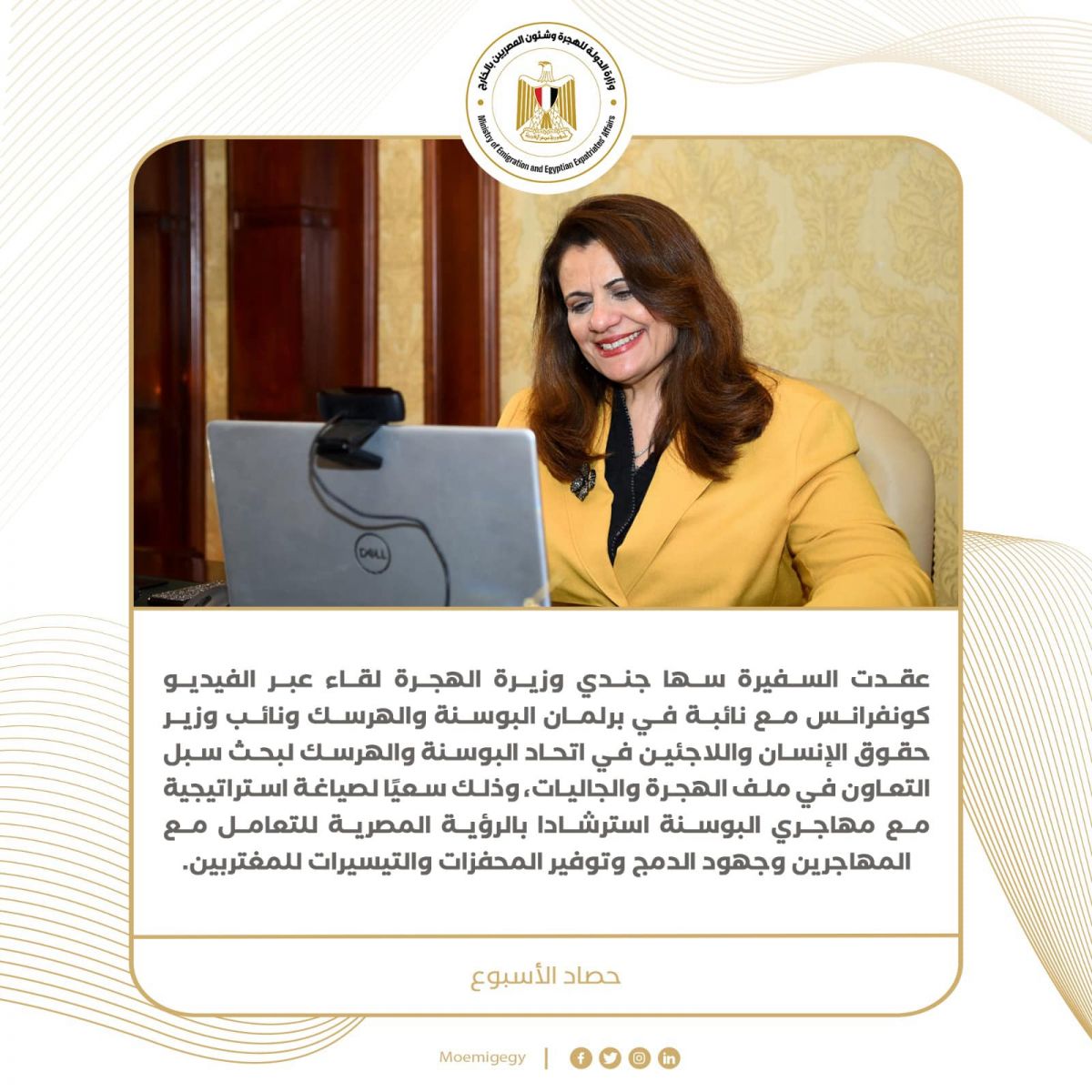 7) عقدت السفيرة سها جندي وزيرة الهجرة لقاء عبر الفيديو كونفرانس مع نائبة في برلمان البوسنة والهرسك ونائب وزير حقوق الإنسان واللاجئين في اتحاد البوسنة والهرسك لبحث سبل التعاون في ملف الهجرة والجاليات، وذلك سعيًا لصياغة استراتيجية مع مهاجري البوسنة استرشادا بالرؤية المصرية للتعامل مع المهاجرين وجهود الدمج وتوفير المحفزات والتيسيرات للمغتربين.