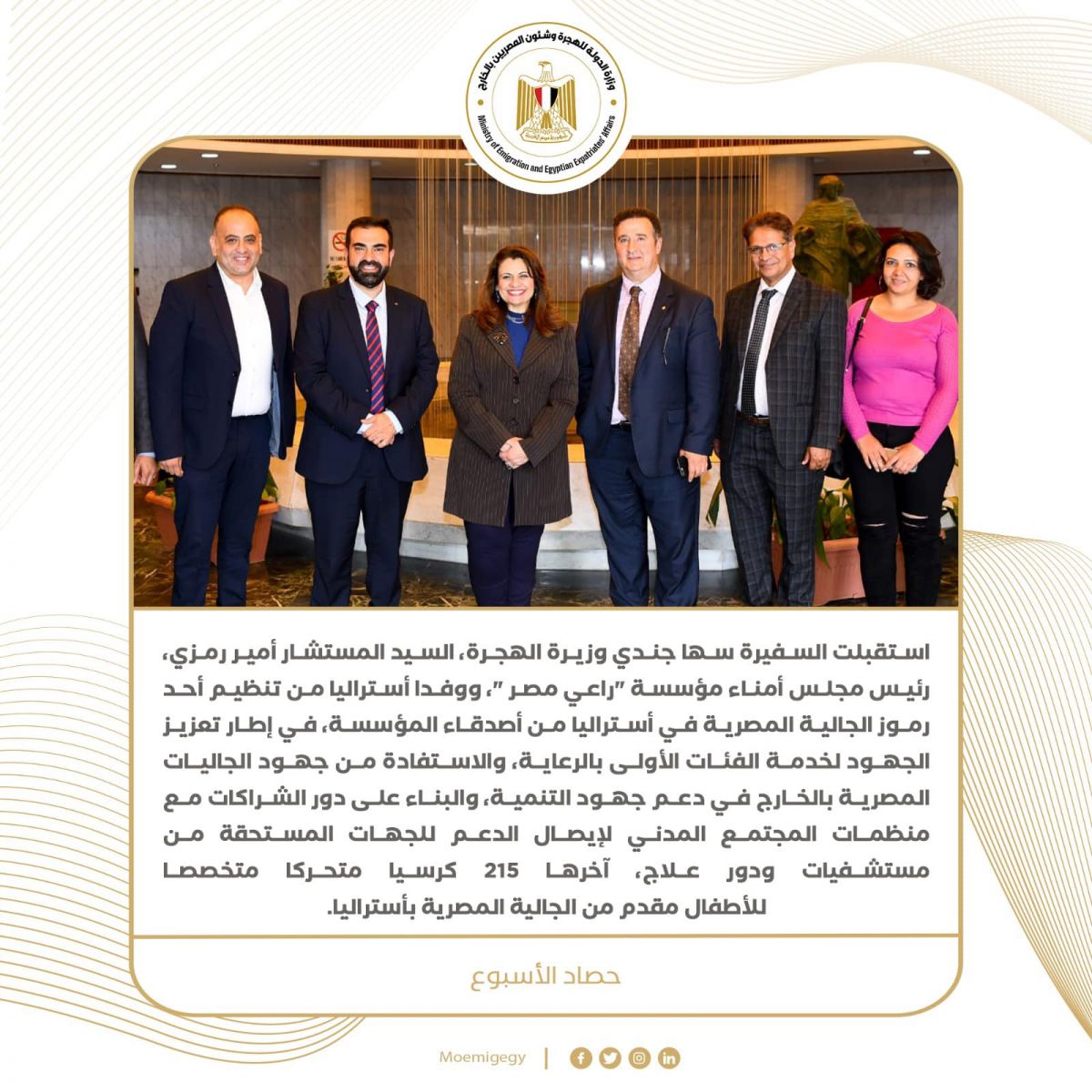 8) استقبلت السفيرة سها جندي وزيرة الهجرة، المستشار أمير رمزي، رئيس مجلس أمناء مؤسسة "راعي مصر "، ووفدا أستراليا من تنظيم أحد رموز الجالية المصرية في أستراليا من أصدقاء المؤسسة، في إطار تعزيز الجهود لخدمة الفئات الأولى بالرعاية، والاستفادة من جهود الجاليات المصرية بالخارج في دعم جهود التنمية، والبناء على دور الشراكات مع منظمات المجتمع المدني لإيصال الدعم للجهات المستحقة من مستشفيات ودور علاج، آخرها ٢١٥ كرسيا متحركا متخصصا للأطفال مقدم من الجالية المصرية بأستراليا.