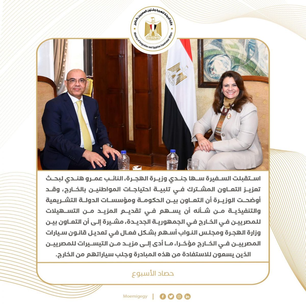 2) استقبلت السفيرة سها جندي وزيرة الهجرة، النائب عمرو هندي لبحث تعزيز التعاون المشترك في تلبية احتياجات المواطنين بالخارج، وقد أوضحت الوزيرة أن التعاون بين الحكومة ومؤسسات الدولة التشريعية والتنفيذية من شأنه أن يسهم في تقديم المزيد من التسهيلات للمصريين في الخارج في الجمهورية الجديدة، مشيرة إلى أن التعاون بين وزارة الهجرة ومجلس النواب أسهم بشكل فعال في تعديل قانون سيارات المصريين في الخارج مؤخرا، ما أدى إلى مزيد من التيسيرات للمصريين الذين يسعون للاستفادة من هذه المبادرة وجلب سياراتهم من الخارج.