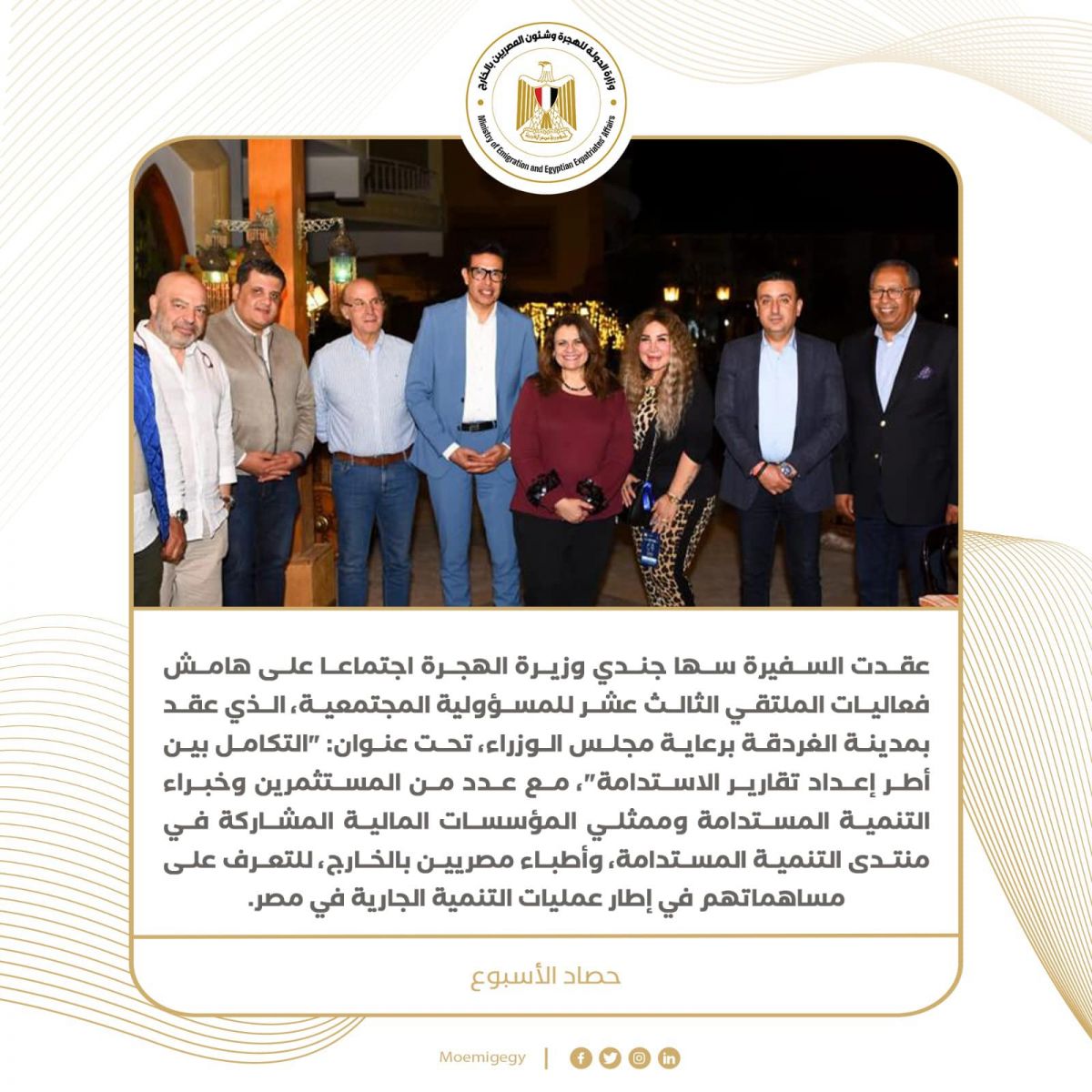 1) عقدت السفيرة سها جندي وزيرة الهجرة اجتماعا على هامش فعاليات الملتقي الثالث عشر للمسؤولية المجتمعية، الذي عقد بمدينة الغردقة برعاية مجلس الوزراء، تحت عنوان: "التكامل بين أطر إعداد تقارير الاستدامة"، مع عدد من المستثمرين وخبراء التنمية المستدامة وممثلي المؤسسات المالية المشاركة في منتدى التنمية المستدامة، وأطباء مصريين بالخارج، للتعرف على مساهماتهم في إطار عمليات التنمية الجارية في مصر.