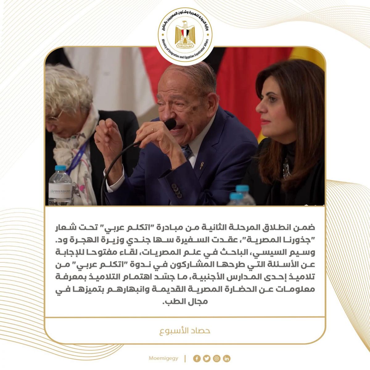 10) ضمن انطلاق المرحلة الثانية من مبادرة "اتكلم عربي" تحت شعار "جذورنا المصرية"، عقدت السفيرة سها جندي وزيرة الهجرة ود. وسيم السيسي، الباحث في علم المصريات، لقاء مفتوحا للإجابة عن الأسئلة التي طرحها المشاركون في ندوة "اتكلم عربي" من تلاميذ المدرسة الأوروبية الألمانية، ما جسّد اهتمام التلاميذ بمعرفة معلومات عن الحضارة المصرية القديمة وانبهارهم بتميزها في مجال الطب.