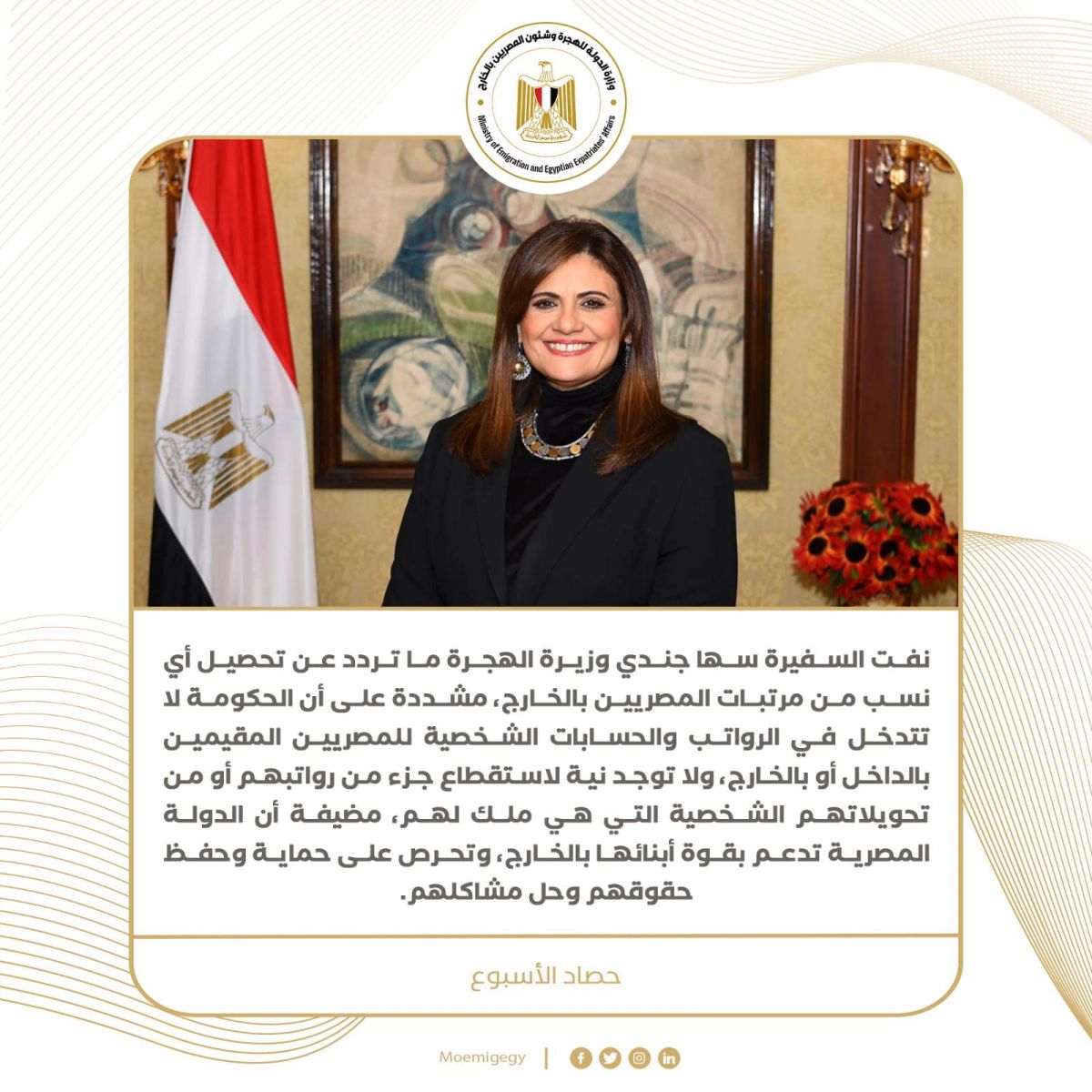 4) نفت السفيرة سها جندي وزيرة الهجرة ما تردد عن تحصيل أي نسب من مرتبات المصريين بالخارج، مشددة على أن الحكومة لا تتدخل في الرواتب والحسابات الشخصية للمصريين المقيمين بالداخل أو بالخارج، ولا توجد نية لاستقطاع جزء من رواتبهم أو من تحويلاتهم الشخصية التي هي ملك لهم، مضيفة أن الدولة المصرية تدعم بقوة أبنائها بالخارج، وتحرص على حماية وحفظ حقوقهم وحل مشاكلهم.