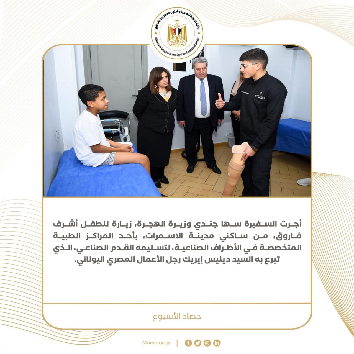 9) أجرت السفيرة سها جندي وزيرة الهجرة، زيارة للطفل أشرف فاروق، من ساكني مدينة الأسمرات، بأحد المراكز الطبية المتخصصة في الأطراف الصناعية لتسليمه قدم صناعي وتركيبه له، والذي كان قد تبرع به دينيس إيريك رجل الأعمال المصري اليوناني.