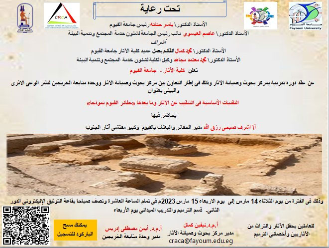 ينظم مركز بحوث وصيانة الآثار بالتعاون مع وحدة متابعة الخريجين لنشر الوعى الأثرى والبيئى بكلية الآثار جامعة الفيوم دورة بعنوان "التقنيات الأساسية فى التنقيب عن الآثار وما بعدها - حفائر الفيوم نموذجًا". يحاضر فى الدورة أشرف صبحى رزق الله مدير الحفاير والبعثات وكبير مفتشى آثار جنوب فى منطقة الآثار بالفيوم.