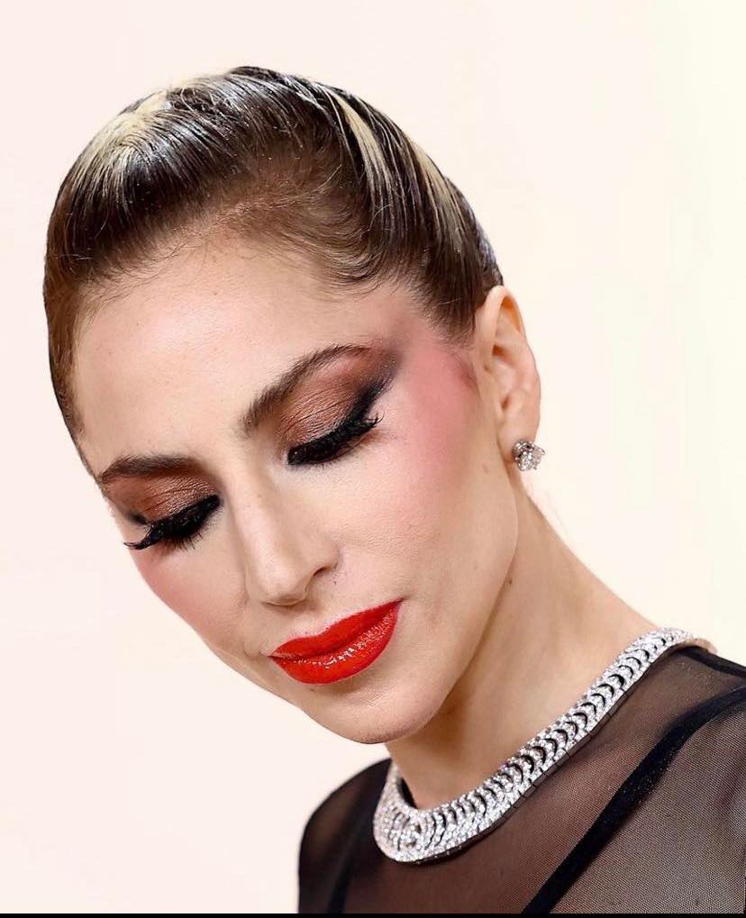 أما من الناحية الجمالية، اعتمدت جاجا تسريحة مميزة، إذ رفعت شعرها الذهبي اللامع وتركته ينسدل