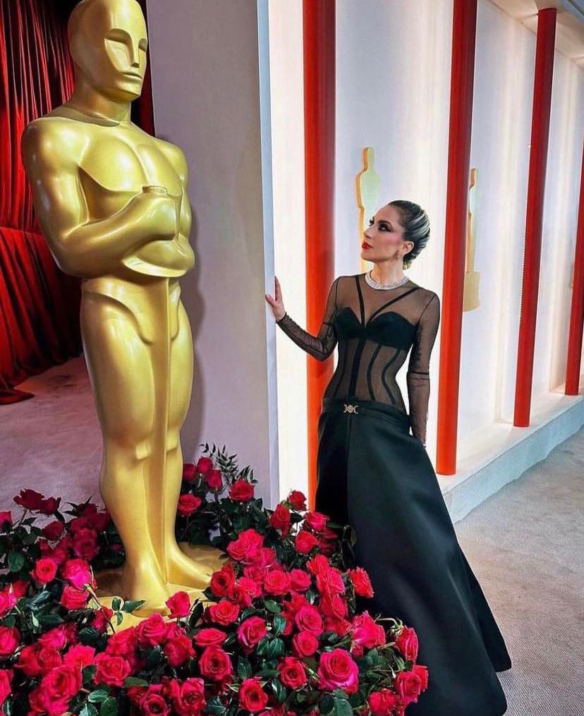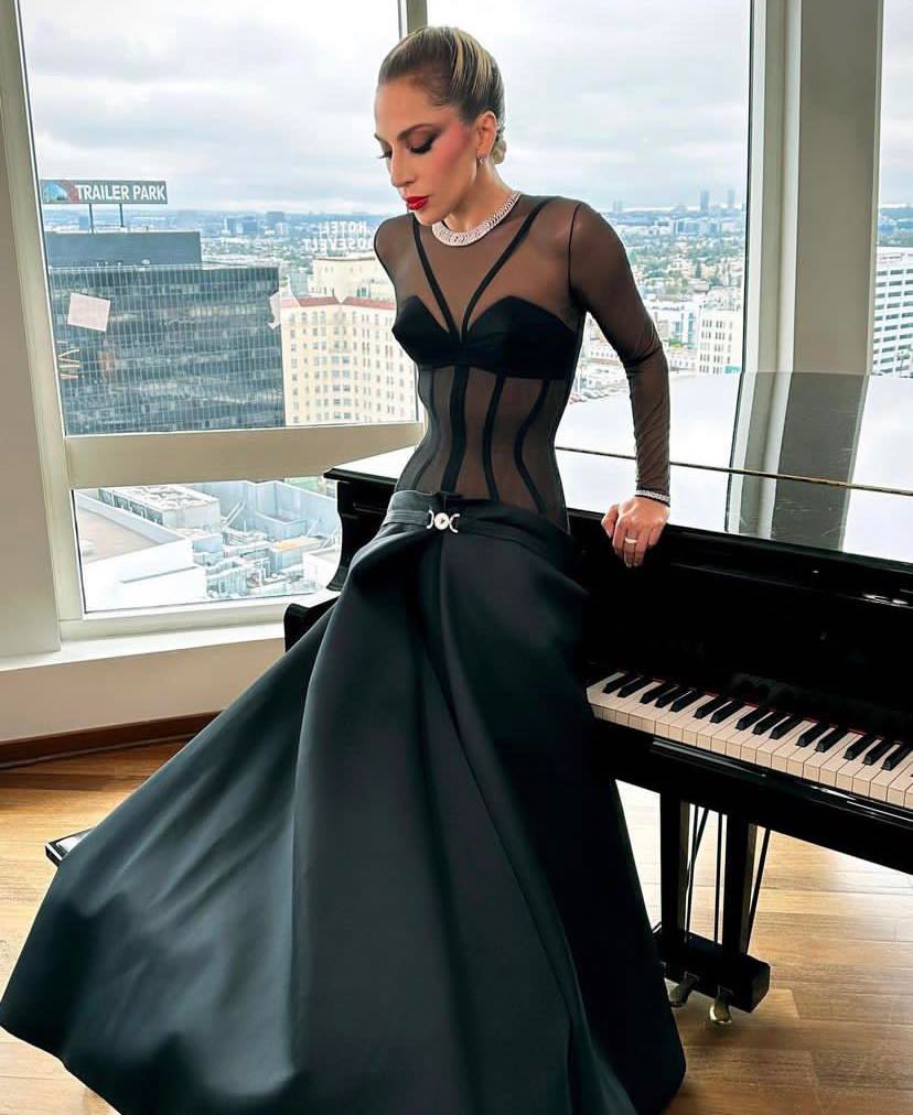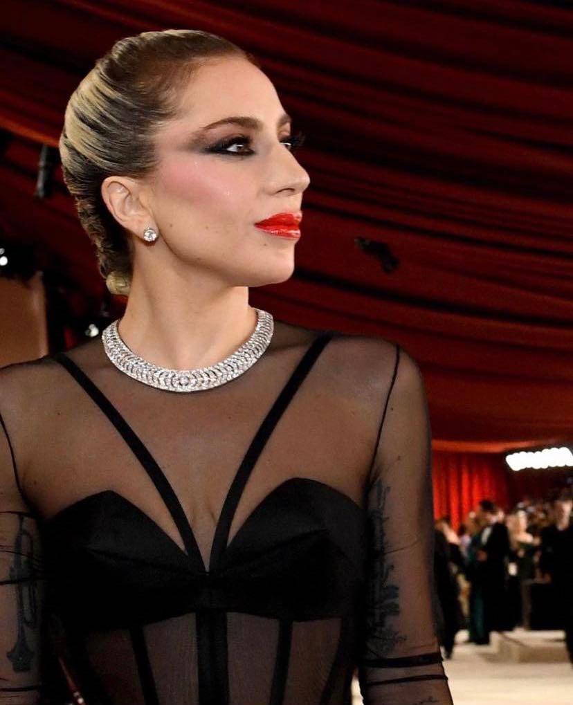 وتألقت ليدي جاجا بفستان مثير من دون بطانة، بتوقيع علامة فيرساتشي ضمن مجموعة خريف وشتاء 2023، وتميز بأنه مكشوف بالكامل عند منطقتي الصدر والظهر، ومصمم من الدانتيل الشفاف الأسود، طويل وذا أكمام طويلة، وبطانة جريئة، ويتوسطه حزام أنيق أعطاه لمسة ناعمة، فيما نسقت عليه مجموعة من المجوهرات الماسية، مما أبرز أنوثتها وقوامها الرشيق الممشوق.
