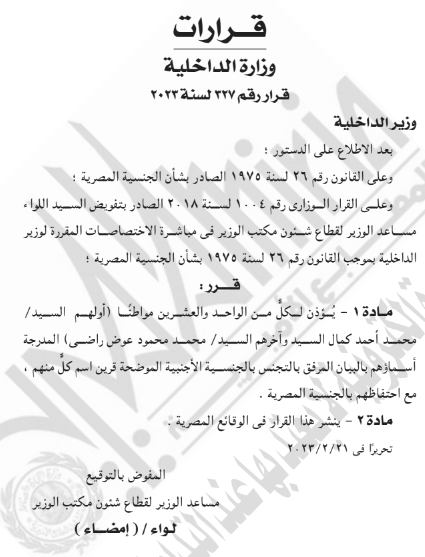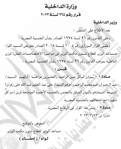 جاء قرار وزير الداخلية بعد الاطلاع على الدستور، وعلى القانون رقم 26 لسنة 1975 الصادر بشأن الجنسية المصرية، وعلى القرار الوزاري رقم 1004 لسنة 2018 الصادر بتفويض اللواء مساعد الوزير لقطاع