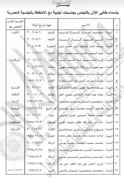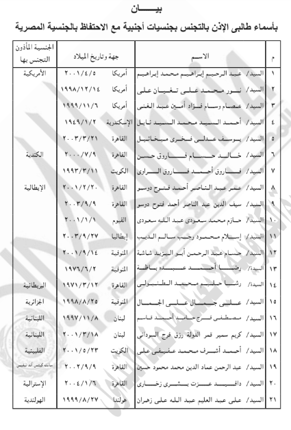 وتقرر في المادة الأولى بأن يُؤذن لكل من الواحد والعشرين مواطنًا، أولهم إسلام أحمد رمضان عبدالمطلب، وآخرهم عمار حسن محمد آدم، المدرجة أسماءهم بالبيان المرفق بالتجنس بالجنسية الأجنبية الموضحة قرين اسم كل منهم، مع الاحتفاظ بالجنسية المصرية.