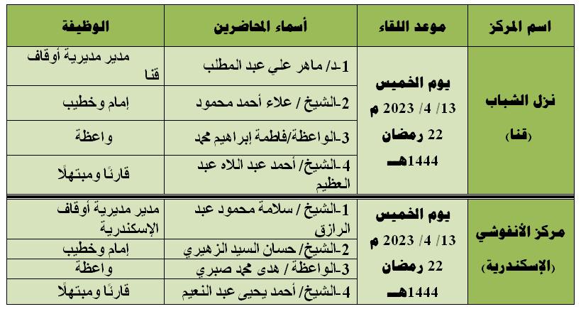 1- نزل الشباب بمحافظة قنا (يوم الخميس 13 / 4 / 2023 – الموافق 22 رمضان 1444هــ).