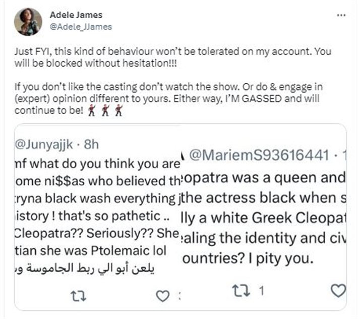 وجاءت تغريدة أديل جيمس رداً على الانتقادات والتعليقات السلبية التي انهالت عليها بعد عرض الإعلان الترويجي الأول للمسلسل الوثائقي الجديد الذي أنتجته منصة نتفليكس الإلكترونية حول حياة الملكة الفرعونية كليوباترا، والذي كشف عن أنها ستقوم بتجسيد دور الملكة كليوباترا، على الرغم من بشرتها السمراء والبعيدة كل البعد عن اللون الحقيقي لبشرة كليوباترا بحسب تاريخ مصر الفرعوني.