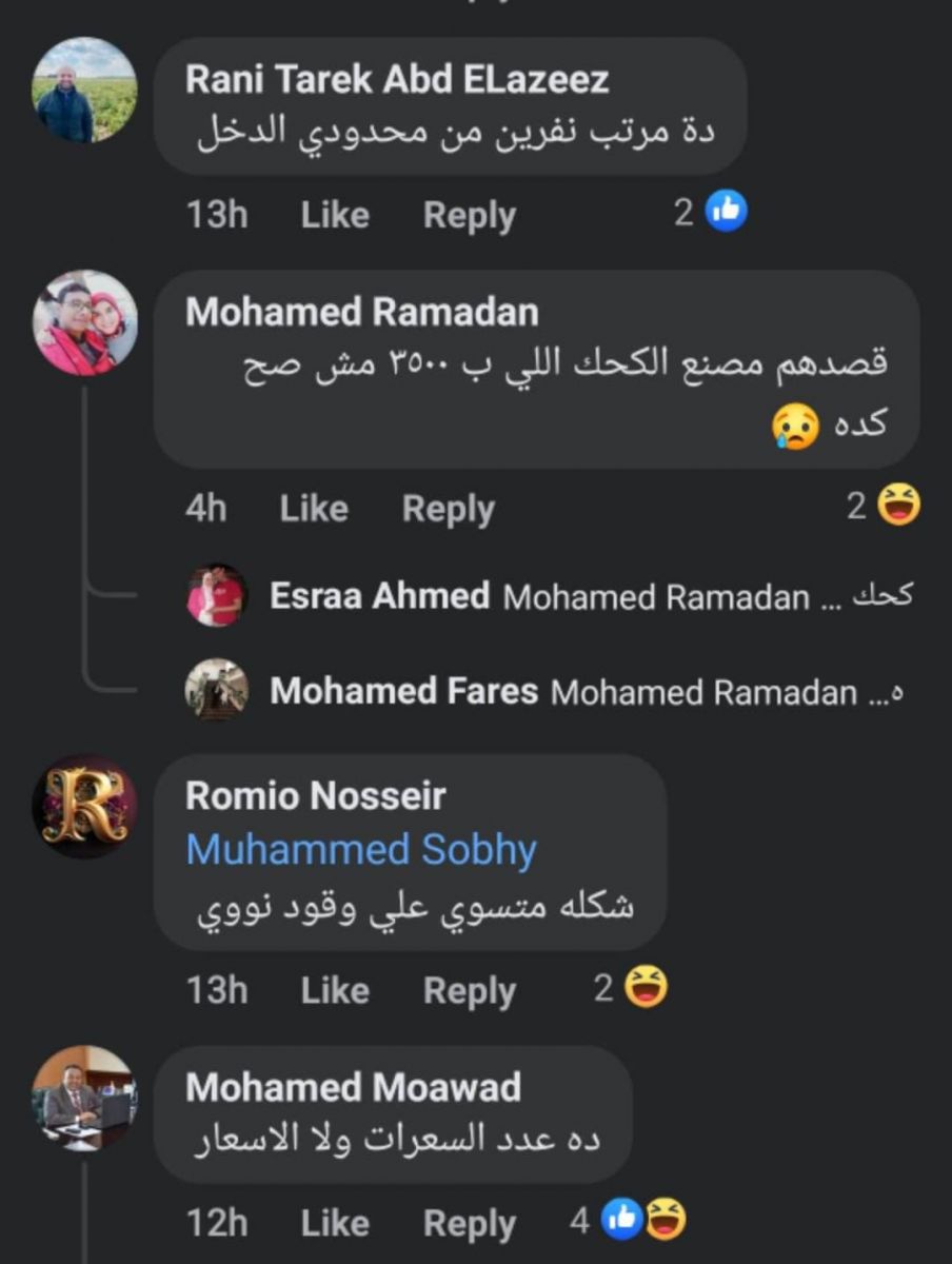 حاز المنشور على بعض التعليقات من أعضاء الجروب ما بين السخرية والغضب، وأبرزها: "يمكن كحك مرصع بالذهب"، " ده أكيد سعر الطن"، "ده مرتب نفرين من محدودي الدخل"،"يعني براتب زوجي نجيب نصف كيلو فقط ومناكلش ولا ندفع أي مصاريف باقي الشهر"، "شكله مستوي على وقود نووي".