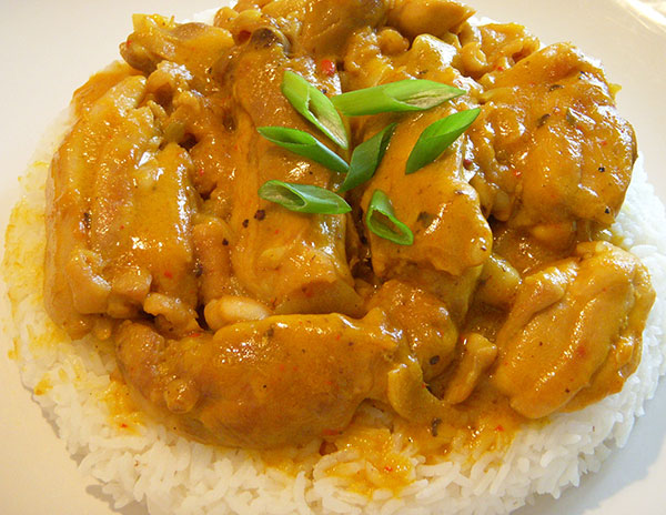 اسكبي دجاج الكاري في طبق التقديم وقدميه ساخنًا بجانب الأرز الأبيض المفلفل.