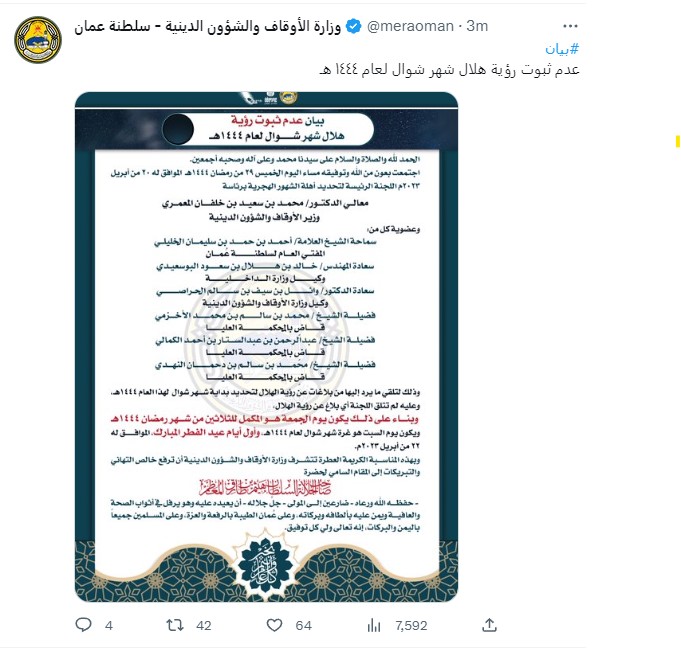 أعلنت وزارة الأوقاف والشئون الدينية بسلطنة عمان، عن عدم ثبوت رؤية هلال شهر شوال لعام 144 هجريًّا، وبناءً عليه يكون غدًا الجمعة هو المتمم لشهر رمضان، والسبت هو غرة شهر شوال وأول أيام عيد الفطر المبارك.
