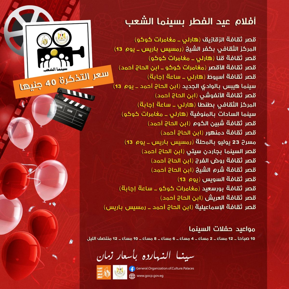 تقدم الهيئة العامة لقصور الثقافة برئاسة المخرج هشام عطوة، ضمن احتفالات عيد الفطر المبارك، أفلام موسم العيد ضمن مشروع سينما الشعب في مواقعها الثقافية بالقاهرة والمحافظات.