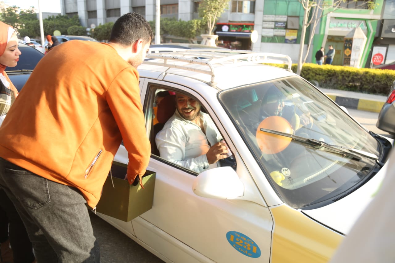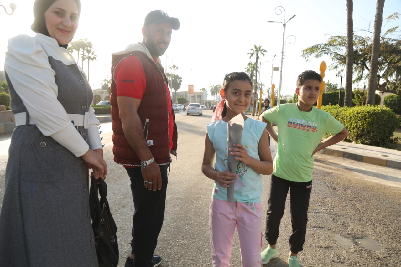 توزيع الورود وكروت تهنئة رئيس الجمهورية على المارة احتفالًا