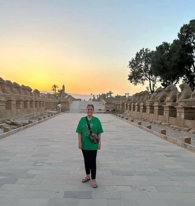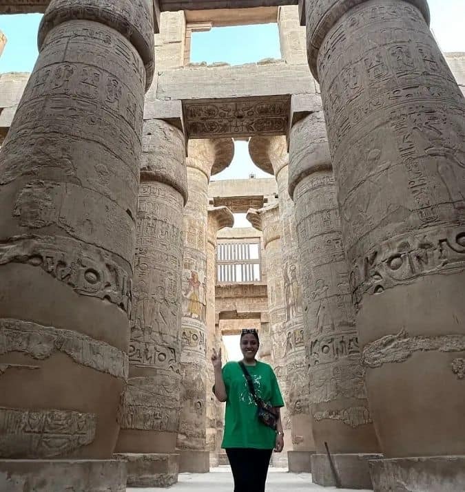 التقطت مي صورًا لها فى صالة الأعمدة الكبرى وطريق الكباش العظيم.