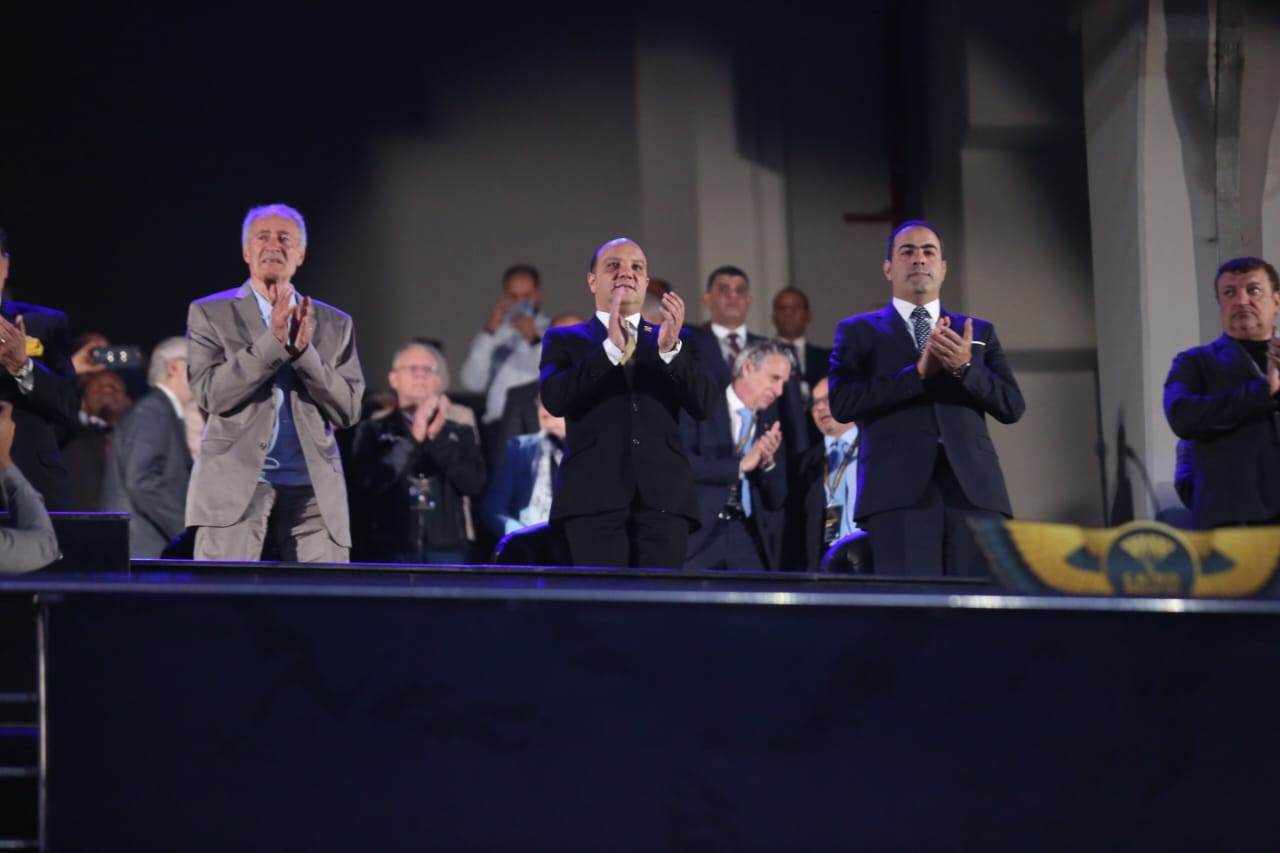 واللواء احمد ناصر رئيس الاتحادات الافريقية الأوكسا، والدكتور ايهاب امين رئيس الاتحادين المصري والافريقي للجمباز، والمهندس شريف العريان رئيس الاتحاد الخماسي الحديث والأمين العام للجنة الأولمبية، والدكتور محمد الكردي رئيس الإدارة المركزية للاداء الرياضي نائبًا عن الدكتور أشرف صبحي وزير الشباب والرياضة،