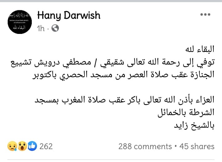 وأعلن شقيق مصطفى درويش، هاني درويش، خبر وفاة شقيقه البالغ من العمر 42 عامًا، وكتب عبر حسابه الشخصي بموقع التواصل الاجتماعى قائلًا: "البقاء لله توفى إلى رحمة الله تعالى شقيقي، مصطفى درويش، وتشييع الجنازة عقب صلاة العصر من مسجد الحصري بأكتوبر".