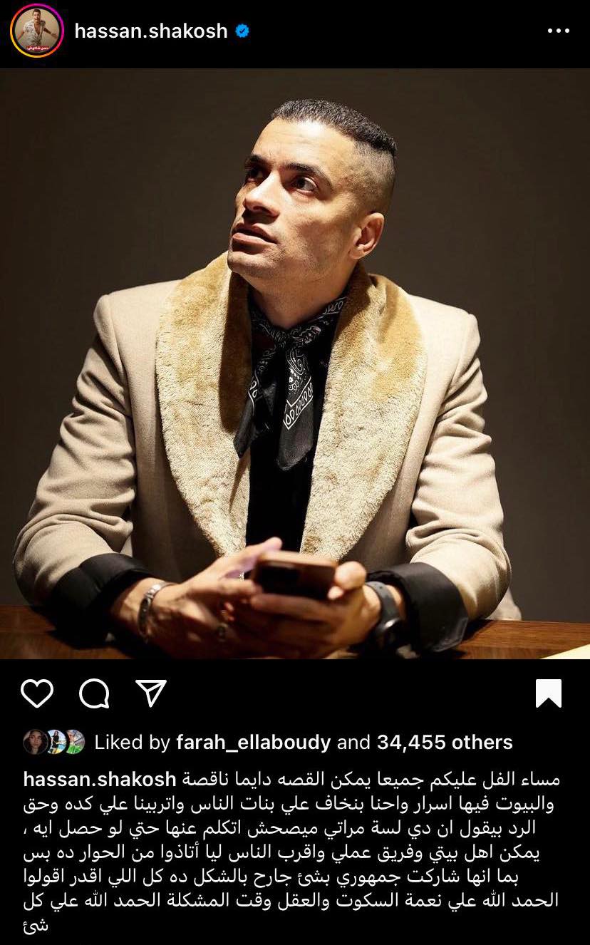 نشر حسن شاكوش صورته وأرفقها برسالة مثيرة للجدل ردًا على أزمته مع زوجته قائلًا: "مساء الفل عليكم جميعًا، يمكن القصة دايمًا ناقصة والبيوت فيها أسرار، واحنا بنخاف على بنات الناس واتربينا على كده، وحق الرد بيقول إن دي لسه مراتي ميصحش أتكلم عنها حتى لو حصل إيه".